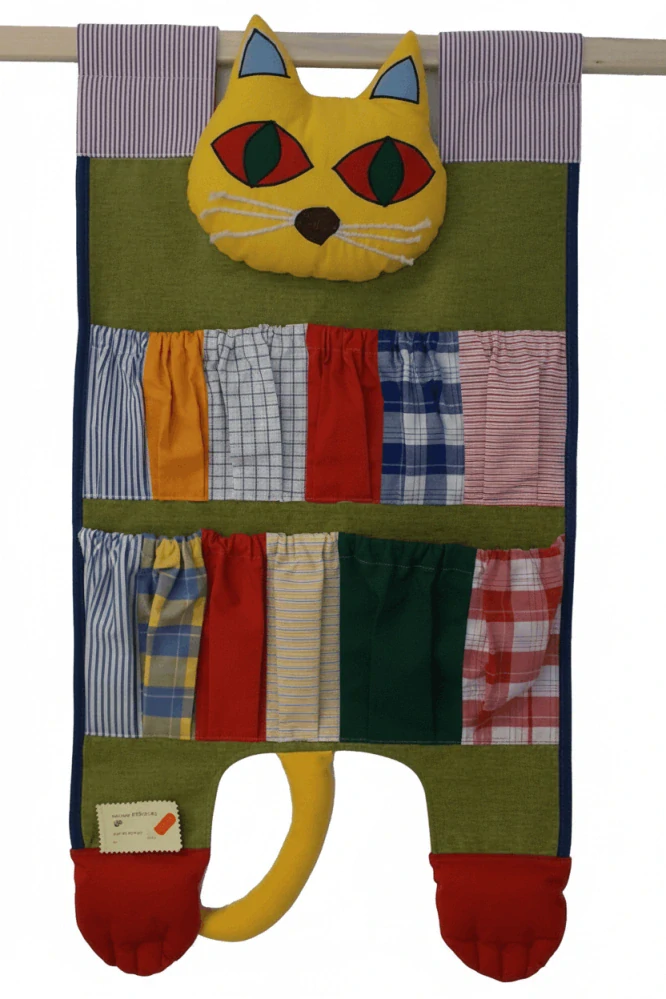 Textilní dětský kapsář slouží k uložení drobností v dětském pokoji. Základem jsou barevné kapsy, doplněné o volitelný motiv hlavy (např. strašidlo, opička, holčička, chlapeček, kočička), který určuje výsledný vzhled.