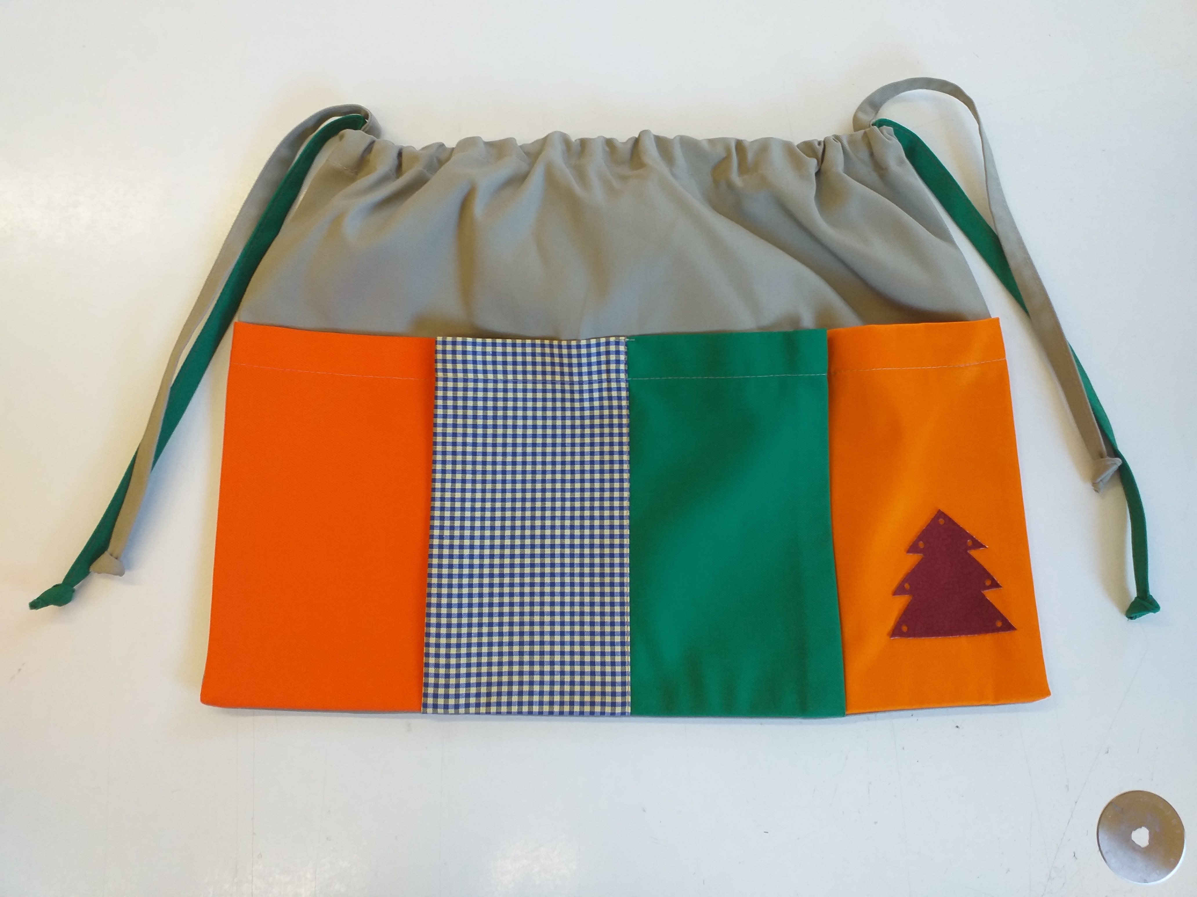 Kapsář se šňůrkami na uvázání k lavici. Kapsa s gumičkou + dvě menší kapsy. Nášivka. Délka 42 cm x  výška 32 cm. Polyester 65%, bavlna 35%. celý popis