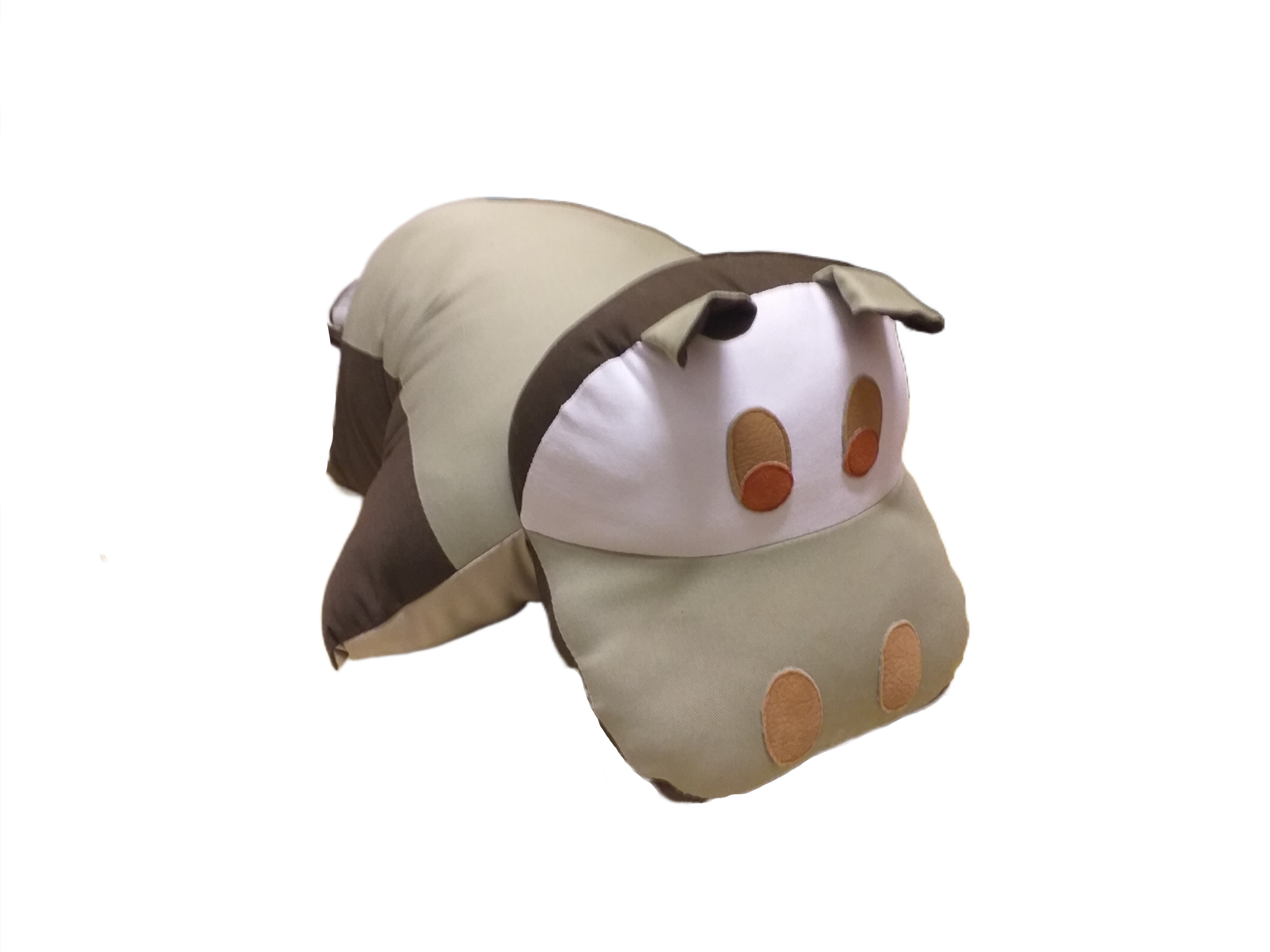 Textilní hroch slouží jako dekorativní prvek i praktický polštářek. Po rozvázání mašličky na spodní straně se rozloží do plochého tvaru vhodného pro odpočinek.