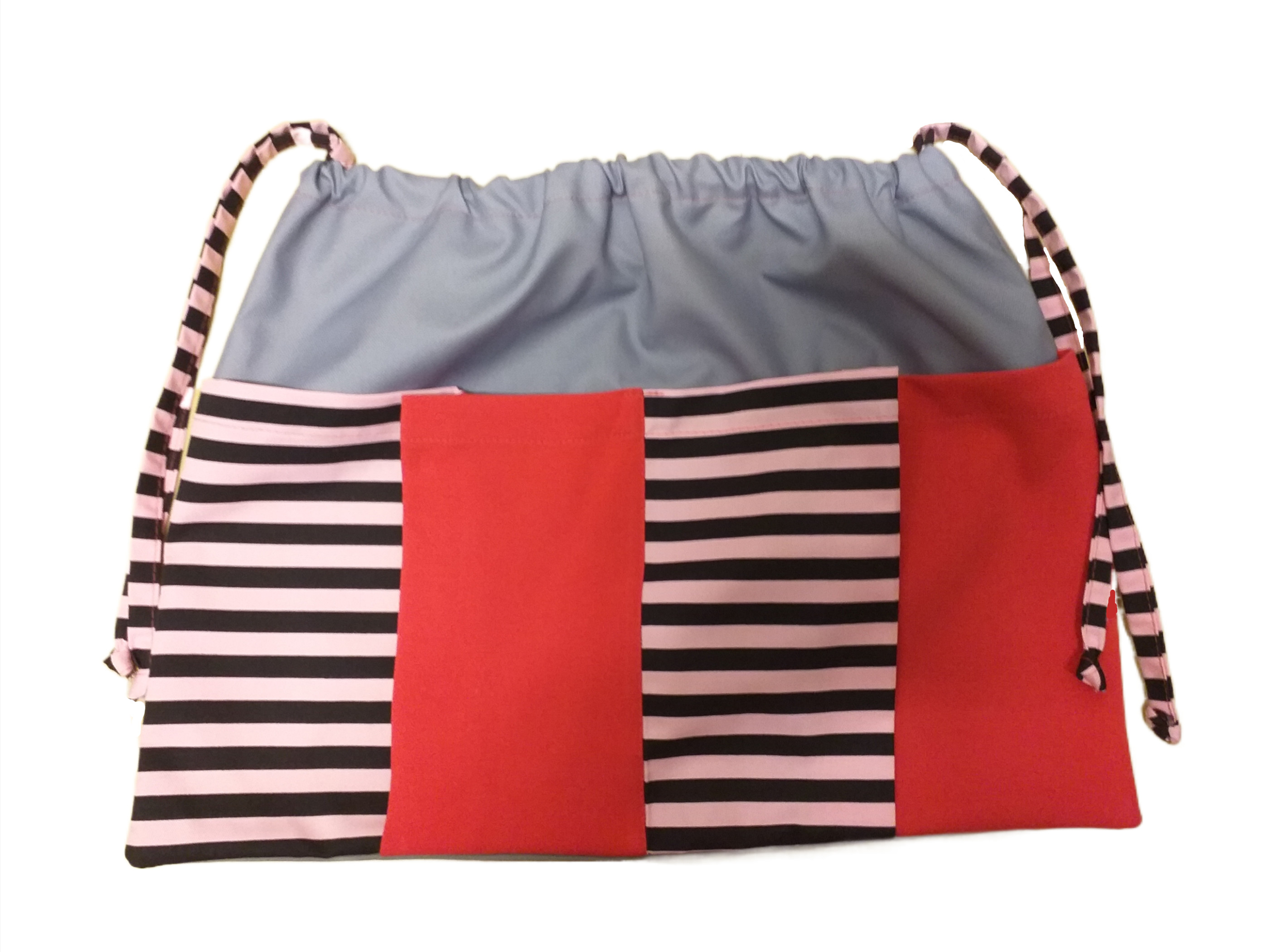 Kapsář se šňůrkami na uvázání k lavici. Kapsa s gumičkou + dvě menší kapsy. Nášivka. Délka 42 cm x  výška 32 cm. Polyester 65%, bavlna 35%. celý popis