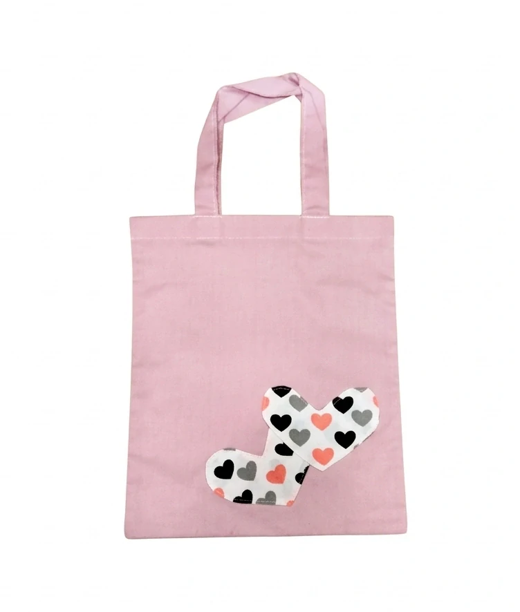 Textilní dětská taška v růžovém provedení s aplikací srdíček. Navržena pro každodenní použití – na přezůvky, hračky nebo drobné nákupy.