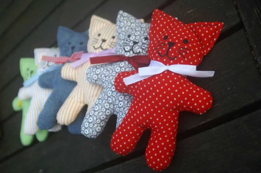 Kočička má charakteristické velké ouška a je dostupná v různých barevných a vzorových variantách podle použité látky. Každý kus se může mírně lišit, protože je ručně vyráběný.